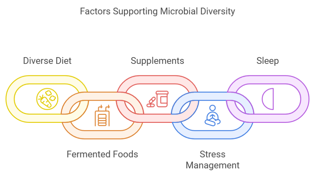 Microbial diversity is a cornerstone of a healthy microbiome. A diverse microbiome is more resilient, able to adapt and respond to environmental changes, pathogens, and disruptions. High diversity can be achieved through varied diets, exposure to different environments, and a lifestyle that minimises unnecessary use of antibiotics and medications.